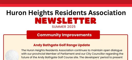 The Huron Heights Residents Association is committed to strengthening and developing community relationships by hosting social and recreational events, informing the membership of issues regarding our neighbourhood and to advocate on the behalf of the community.